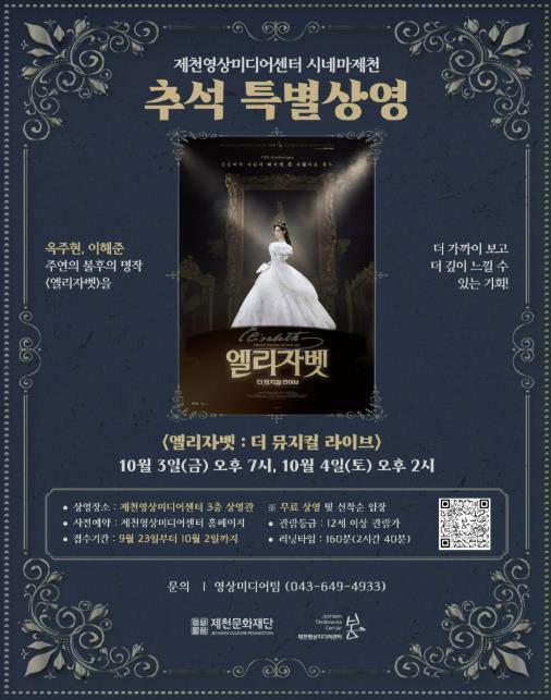 [중앙뉴스라인, 우제헌기자] 제천문화재단이 추석 연휴 기간인 10월 3일 오후 7시와 10월 4일 오후 2시, 제천영상미디어센터 3층 상영관에서 옥주현 주연의 뮤지컬 공연 실황 영화 '엘리자벳 : 더 뮤지컬 라이브'를 무료 상영한다.