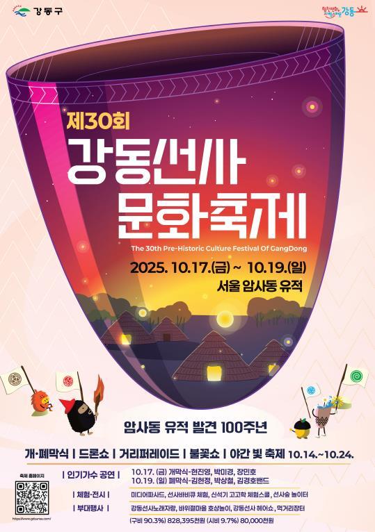 강동구는 오는 10월 17일부터 19일까지 3일간, 서울 암사동 유적(올림픽로 875)과 암사초록길 일대에서 ‘제30회 강동선사문화축제’를 성대하게 개최한다고 밝혔다.