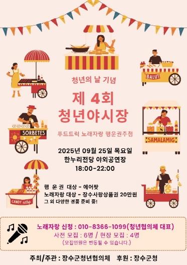 [중앙뉴스라인, 우제헌기자] 장수군은 오는 25일 오후 6시부터 장수한누리전당 야외공연장에서 ‘제4회 청년의 날 기념 장수 청년 야시장’을 개최한다고 밝혔다.