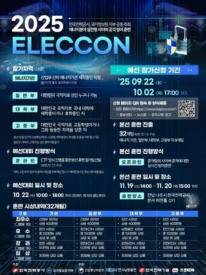 한국전력(대표이사 사장 김동철)이 사이버보안 전문인력 양성과 에너지분야 협력체계를 강화하기 위하여 국정원 지부와 공동으로 ‘2025년 실전형 사이버공격 방어훈련’(ELECCON 2025)을 개최한다.