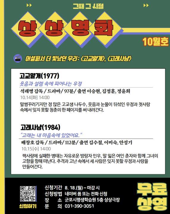 [중앙뉴스라인, 우제헌기자] 군포문화재단 군포시평생학습원은 시민들의 문화 향유와 세대 공감을 위해 오는 10월 14일과 15일 상상극장에서 고전 영화 상영 프로그램 〈상상명화〉를 운영한다. 이번 상영작은 ‘고교얄개’와 ‘고래사냥’으로 무료 상영된다.
