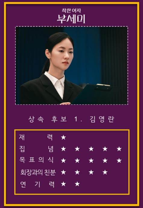 특히 김영란과 달리 의붓아버지 가성호 회장에 대한 고마움도, 애정도 없어 오직 그가 죽은 뒤 남겨질 유산에만 눈독을 들이고 있다.