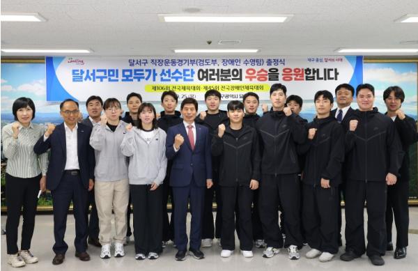 [중앙뉴스라인, 우제헌기자] 대구 달서구는 달서구 직장운동경기부 실업팀(검도부, 장애인 수영팀)이 부산광역시에서 열리는 제106회 전국체육대회(2025. 10.17.~23.) 및 제45회 전국장애인체육대회(2025. 10.31.~11.5.)에 대구시 대표로 출전함에 따라 선수단 출정식을 갖고 선전을 다짐했다.