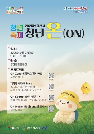 [중앙뉴스라인, 우제헌기자] 양산시는 청년의 날과 청년주간을 맞아 오는 27일 오후 1시부터 양산종합운동장에서 '2025 양산시 청년축제 ‘청년 온(ON)’'을 개최한다고 밝혔다.