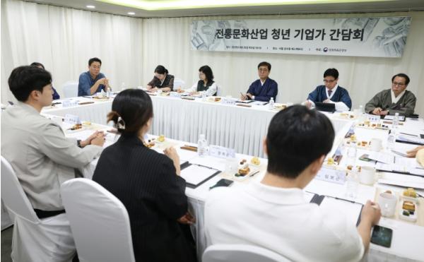 이번 간담회는 전통문화산업의 지속 가능한 성장을 뒷받침하고, 현장의 목소리를 직접 정책에 반영하기 위해 마련한 자리다. 전통공예, 한복, 한지 등 다양한 분야의 청년 기업인과 전문가들이 참석해 ▴전통문화 상품의 판로 개척 및 해외 진출 지원, ▴창업 초기 기업의 자금 지원 확대, ▴전통문화 콘텐츠 기획·투자 강화 등 다양한 의견을 제시했다. 한 청년 창업가는 “전통문화산업은 짧은 시기에 성과를 내기 어려운 산업이다. 청년 기업인들이 전통의 가치를 지키면서도 창의성을 발휘해 나갈 수 있도록 정부의 지속적인 지원을 기대한다.”라고 말했다.
