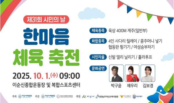 기념식 후에는 한마음 체육축전으로 이어진다. 이순신종합운동장과 복합스포츠센터 일원에서 오후 4시까지 진행되며, 총 8천여 명이 참여할 예정이다. 또 초청가수 박구윤, 채우리, 김보경 공연과 함께 읍면동 대항 체육대회, 홍보·체험부스 운영 등 다양한 프로그램이 마련된다.