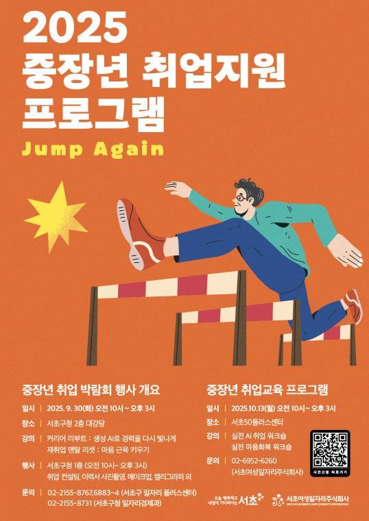 [중앙뉴스라인, 우제헌기자] 서울 서초구는 중장년의 구직 활동을 응원하기 위해 오는 30일 취업지원 프로그램 ‘점프 어게인(JUMP AGAIN)’을 개최한다고 밝혔다.