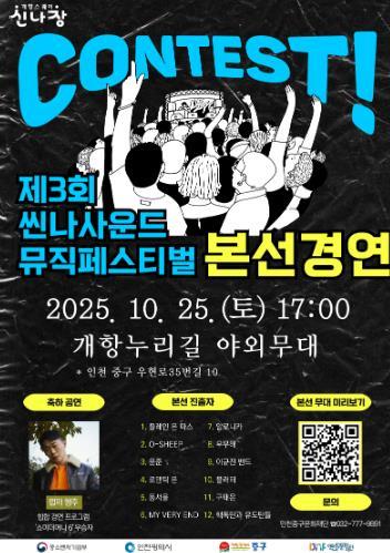 (재)인천중구문화재단은 오는 10월 25일 오후 5시 인천 중구 개항누리길 야외무대에서 ‘제3회 씬나사운드 뮤직 페스티벌’ 본선 경연을 개최한다고 밝혔다.