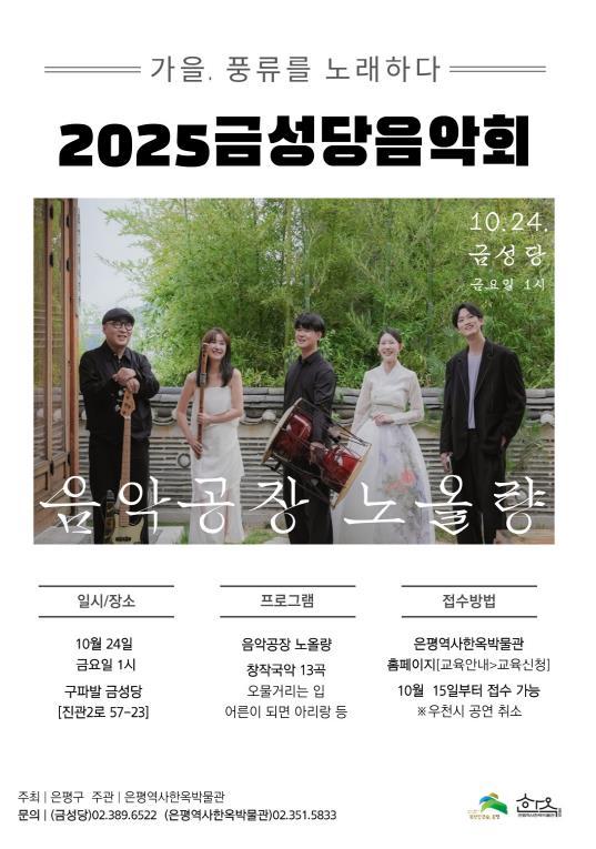 [중앙뉴스라인, 우제헌기자] 서울 은평구는 10월 24일 오후 1시 은평뉴타운 아파트 숲 사이에 자리한 금성당에서 ‘음악회’를 개최한다고 밝혔다.