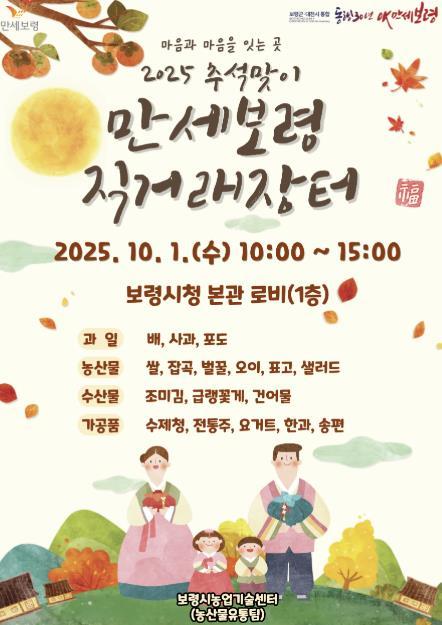 [중앙뉴스라인, 우제헌기자] 보령시는 추석을 맞아 10월 1일 보령시청 본관 1층 로비에서 ‘2025 추석맞이 만세보령 농특산물 직거래장터’를 운영한다고 밝혔다.