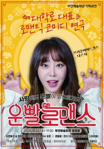 [중앙뉴스라인, 우제헌기자] 부안군은 오는 10월 22일 오후 7시 30분, 부안예술회관 공연장에서 연극 ‘운빨로맨스’를 공연한다.