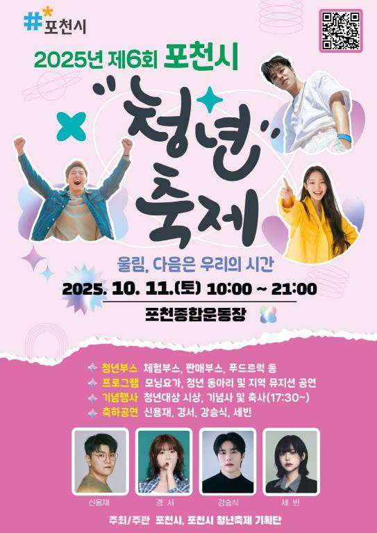 저녁에는 포천시 홍보대사 윤태용의 사회로 공식 기념행사와 ‘2025년 포천시 청년대상’ 시상식이 진행된다. 이어 오후 6시 30분부터는 가수 신용재, 경서, 강승식, 세빈이 출연하는 축하공연이 열려 청년과 시민 모두가 함께 즐기는 무대를 선사할 예정이다.