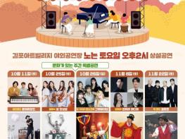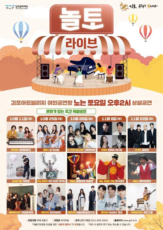 (재)김포문화재단은 10월 11일부터 11월 22일까지 매월 둘째, 넷째 주 토요일마다 김포아트빌리지 야외공연장에서 하반기 토요상설공연 '놀토 라이브'를 개최한다고 밝혔다.