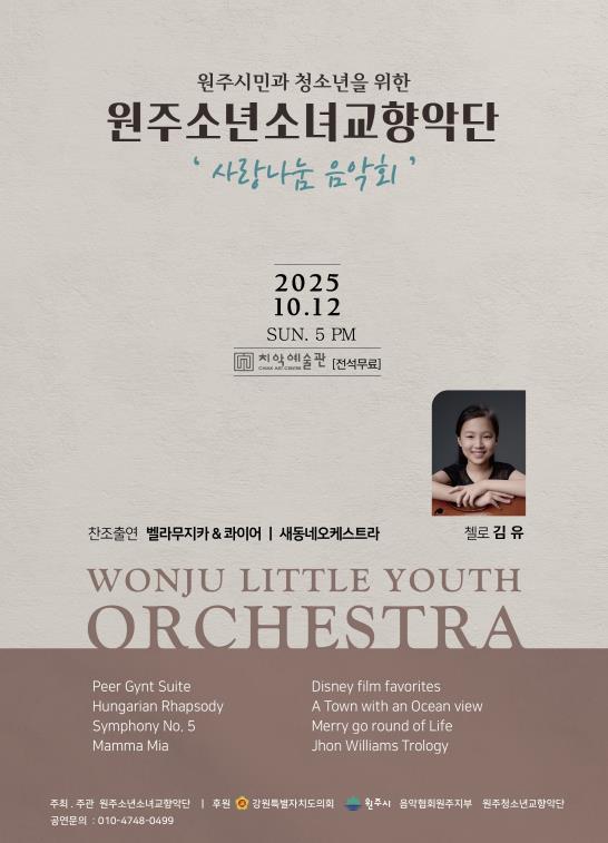 [중앙뉴스라인, 우제헌기자] 원주소년소녀교향악단은 오는 12일 오후 5시, 치악예술관에서 ‘사랑나눔음악회’를 통해 지역사회와 함께하는 따뜻한 무대를 마련한다.