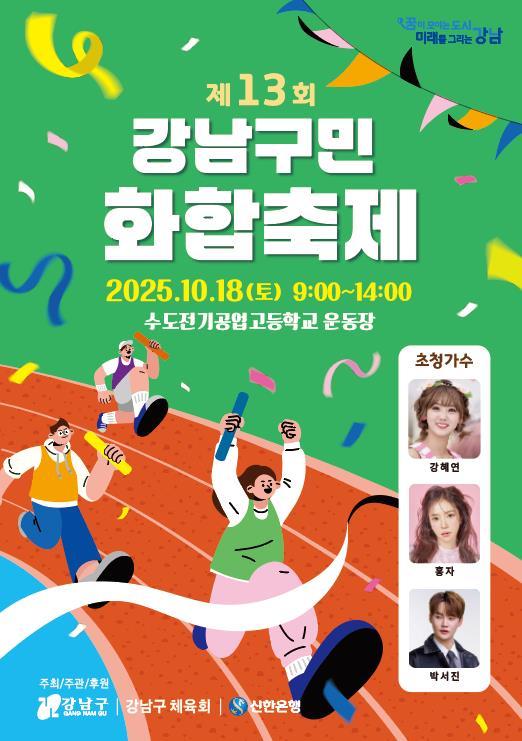 [중앙뉴스라인, 우제헌기자] 꿈이 모이는 도시, 미래를 그리는 강남구가 오는 10월 18일 오전 9시부터 오후 2시까지 수도전기공업고등학교 운동장에서 ‘제13회 강남구민화합축제’를 개최한다. 구민과 선수단 등 약 7,500명이 참여할 예정이며, 소통과 화합을 바탕으로 건강한 지역사회를 만드는 의미 있는 자리가 될 것으로 기대된다.