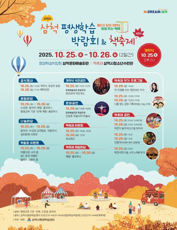 [중앙뉴스라인, 우제헌기자] 삼척시는 오는 10월 25일부터 26일까지 이틀간 삼척문화예술회관과 삼척시청소년수련관 일원에서 ‘제16회 삼척평생학습박람회 및 제6회 책축제’를 개최한다.