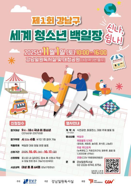 [중앙뉴스라인, 우제헌기자] 꿈이 모이는 도시, 미래를 그리는 강남구가 오는 11월 1일 오전 10시부터 오후 4시까지 강남일원독서실과 대청공원 일대에서 ‘제1회 강남구 세계청소년백일장 신나, 쉼나!’를 개최한다. 이 행사는 국내‧외 국적 청소년이 함께하는 전국 최초의 기초지자체 주관 백일장으로, 다문화 시대와 K-컬처 확산 흐름에 발맞춘 문학축제다.