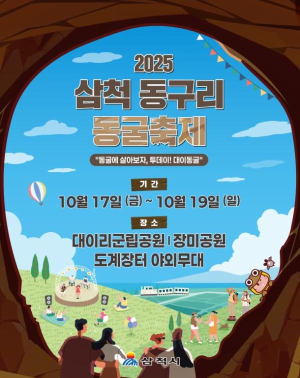 [중앙뉴스라인, 우제헌기자] 삼척 동구리 동굴축제가 10월 17~19일 대이리군립공원(대이동굴)·삼척장미공원·도계장터 야외무대에서 동시에 열린다. ‘동굴에 살아보자, 투데이! 대이동굴’을 슬로건으로 한 올해 축제는 가족 공연과 실감형 동굴체험, 도심·생활권 무대를 셔틀망으로 연결하는 분산형 운영으로 하루 동선을 완성했다.