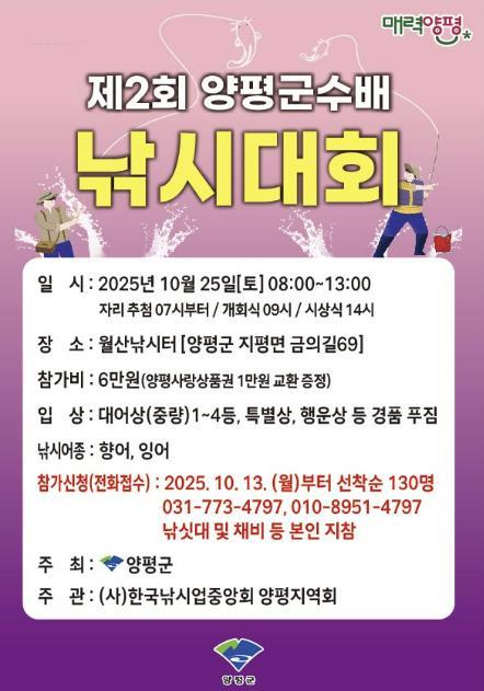 [중앙뉴스라인, 우제헌기자] 양평군은 오는 25일 관내 월산낚시터에서 ‘제2회 양평군수배 낚시 대회’를 개최한다고 밝혔다.