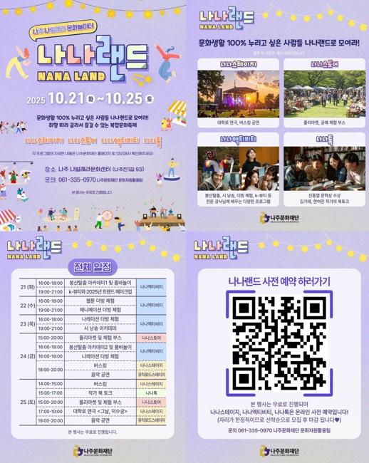 김찬동 나주문화재단 대표이사는 “‘나나랜드’는 시민이 주체가 되어 문화를 함께 만들고 즐기는 축제가 될 것”이라며 “지역의 일상에 문화가 자연스럽게 스며들 수 있도록 시민 중심의 문화예술 프로그램을 지속적으로 추진하겠다”고 말했다.