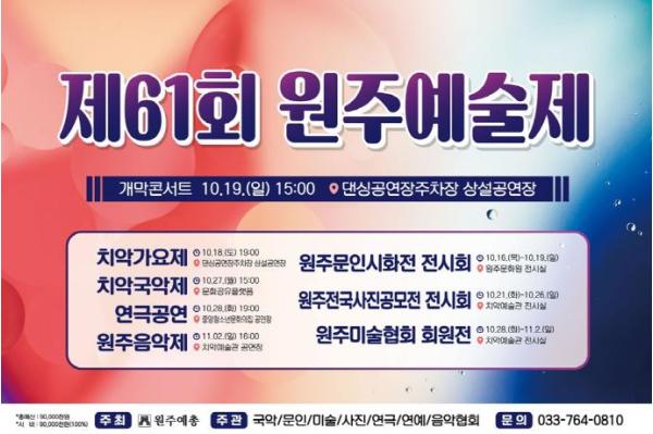 올해로 61회를 맞이한 원주예술제는 지역 예술인들의 창작열과 예술혼이 어우러진 종합 예술축제로, 예술로 하나 되는 시민 화합의 장이자 원주의 대표 문화예술 축제로 자리매김하고 있다.