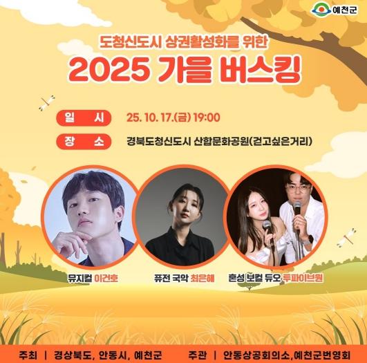 [중앙뉴스라인, 우제헌기자] 예천군은 17일 오후 7시, 도청신도시 걷고싶은거리에서 ‘가을 버스킹’ 공연을 개최하여 지역 주민들에게 가을밤의 낭만을 선사한다.