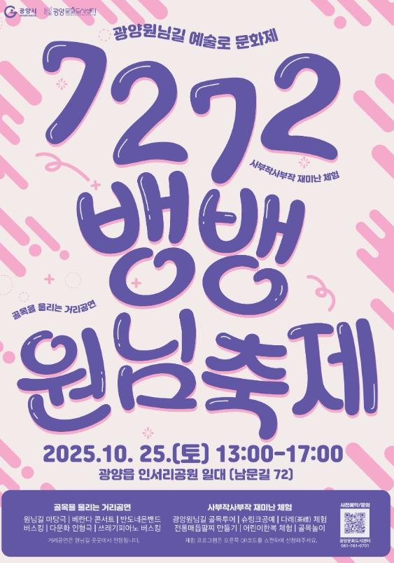 [중앙뉴스라인, 우제헌기자] 광양문화도시센터는 오는 10월 25일 금요일 오후 광양읍 인서리공원 일대에서 광양원님길 브랜드 축제 ‘7272뱅뱅원님축제’를 개최한다고 밝혔다.