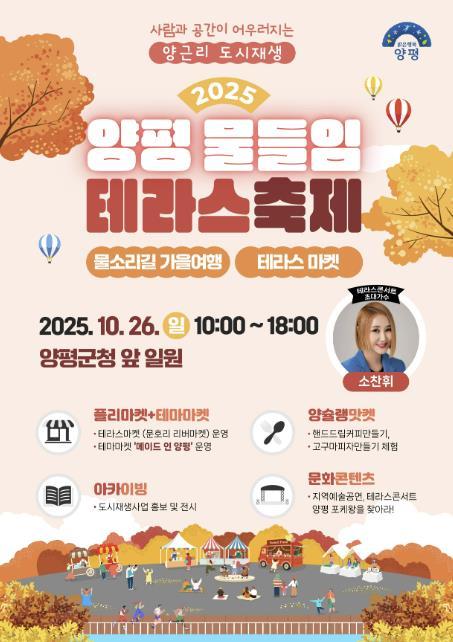 [중앙뉴스라인, 우제헌기자] 양평군은 오는 10월 26일, 양평군청 앞 특설무대 및 주차장 일원에서 ‘2025 양평 물들임 테라스 축제’를 개최한다고 밝혔다.