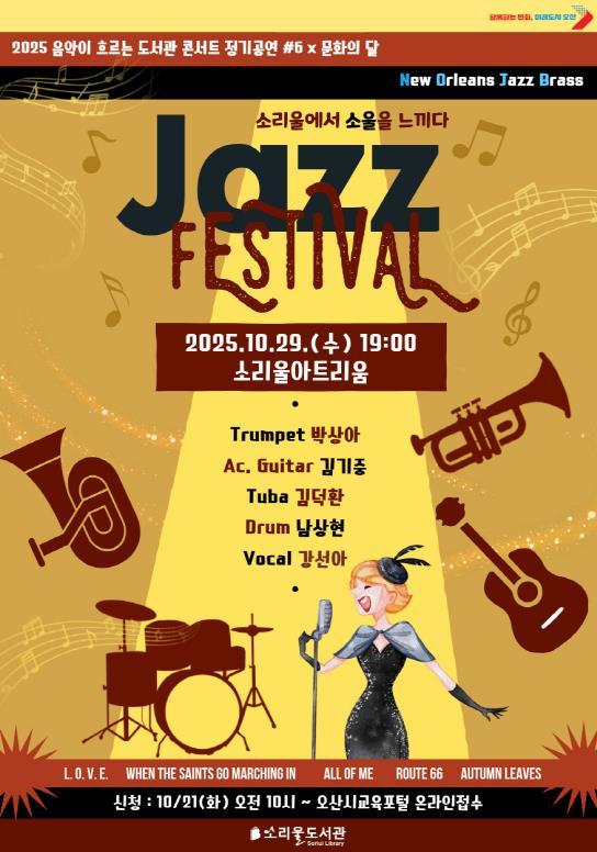 [중앙뉴스라인, 우제헌기자] 경기도 오산시는 오는 10월 29일 오후 7시, 소리울도서관 3층 소리울아트리움에서 '2025 음악이 흐르는 도서관 콘서트 정기공연 #6 × 문화의 달 – Jazz Festival; 소리울에서 소울을 느끼다'를 개최한다고 밝혔다.