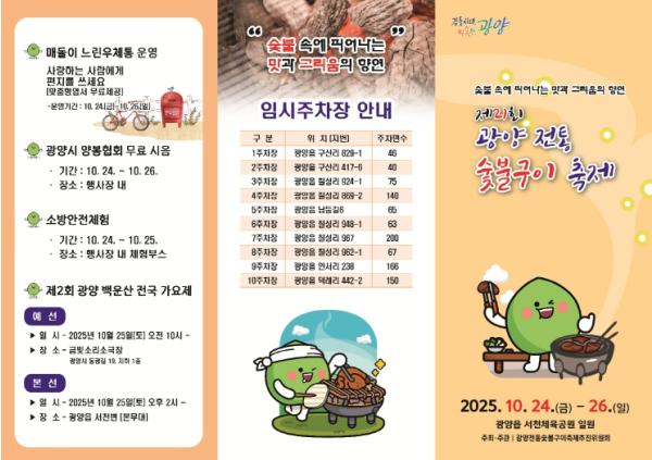 축제 첫날에는 신명나는 농악 한마당으로 막을 올리고, 광양 원님 행차 재현 퍼레이드, 외줄타기 공연, 광양숯불문화 기획무대 ‘미디어 대북공연’ 등 다채로운 프로그램이 이어진다. 또한 개막식과 함께 불꽃놀이와 축하공연이 펼쳐지며 축제의 서막을 장식한다.