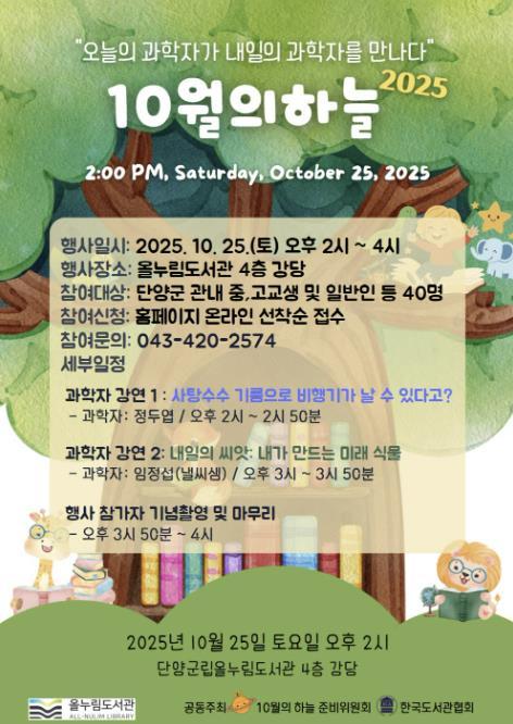 [중앙뉴스라인, 우제헌기자] 충북 단양군립올누림도서관은 오는 25일 오후 2시부터 4시까지 과학자들의 재능기부로 진행되는 ‘10월의 하늘’ 과학 행사를 운영한다고 밝혔다.
