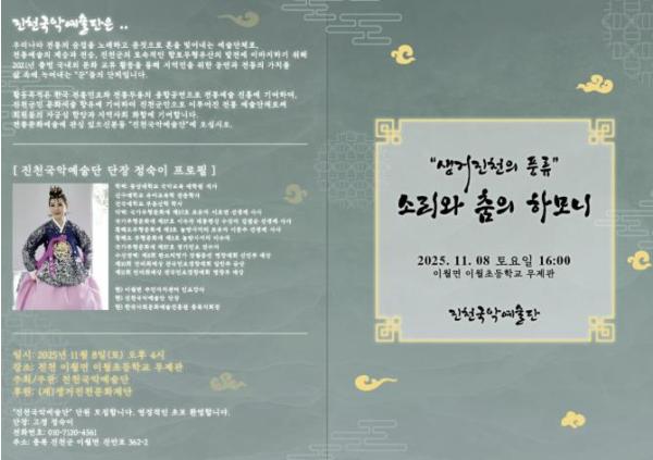 (재)생거진천문화재단은 오는 11월 8일 오후 4시 이월초등학교 ‘무제관’에서 진천국악예술단이 ‘진천의 풍류, 소리와 춤의 하모니’ 공연을 개최한다고 20일 밝혔다.