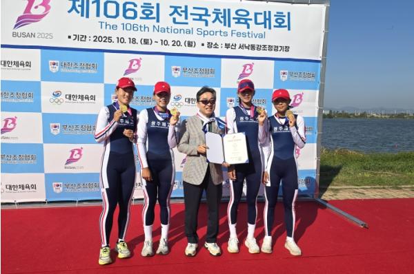 [중앙뉴스라인, 우제헌기자] 광주광역시체육회는 ‘제106회 전국체육대회’ 조정 여자18세이하부 쿼드러플스컬 경기에서 광주체고 조정팀이 3연패를 달성했다고 밝혔다.