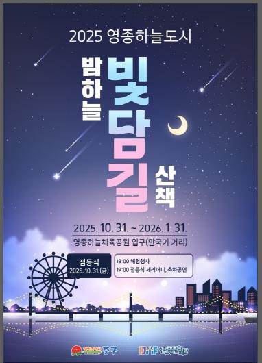 (재)인천중구문화재단(이사장 김정헌)은 올해 10월 31일부터 오는 2026년 1월 31일까지 3개월간 야간 경관조명 ‘2025 영종 빛 축제 - 영종하늘도시 밤하늘 빛담길’을 운영한다고 밝혔다.