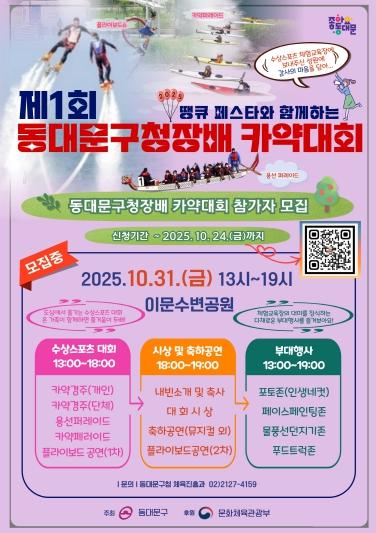 카약대회는 구민 누구나 참여 가능한 대회로, 모집 부문은 스탠드업 패들보드(SUP) 개인전, 카약 개인전·단체전(2인 1조)으로 진행된다. 참가 신청은 24일까지 QR코드를 통해 네이버폼으로 접수 가능하다. 자세한 사항은 동대문구청 체육진흥과로 문의하면 된다.
