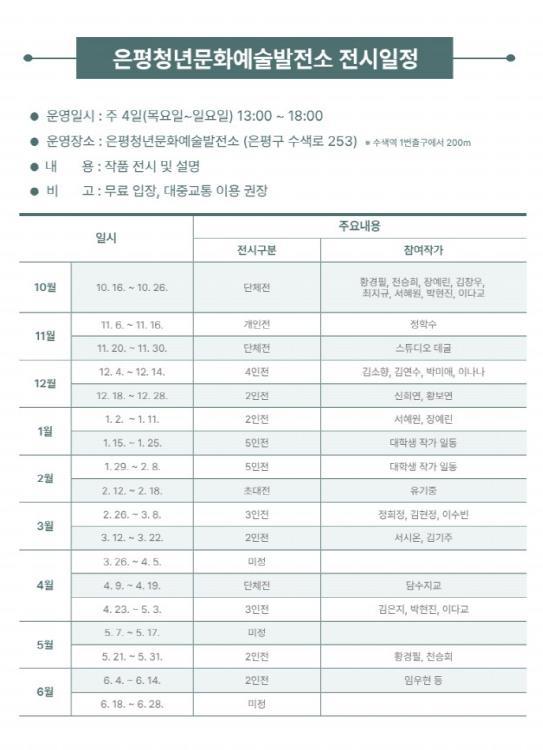 전시는 은평청년문화예술발전소에서 매주 목요일부터 일요일, 오후 1시부터 6시까지 진행되며, 방문객들은 누구나 자유롭게 관람할 수 있다. 특히 매달 2~3회 전시회가 변경돼 새로운 작품들이 계속해서 선보일 예정이니, 은평구민들의 많은 관심과 방문을 바란다.