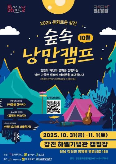 [중앙뉴스라인, 우제헌기자] 강진군과 강진군문화관광재단은 2025 문화가 있는 날–구석구석 문화배달 사업의 하나로 ‘캠핑과 함께하는 문화로운 강진’ 2차 행사를 오는 10월 31일부터 11월 1일까지 병영면 하멜 감성텐트촌에서 갖는다.