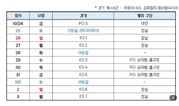 [중앙뉴스라인, 우제헌기자] 삼성 라이온즈와 한화 이글스의 2025 신한 SOL뱅크 KBO 플레이오프 5차전이 10월 24일(금)에 개최된다. 따라서 포스트시즌 각 시리즈 간 최소 1일의 이동일이 확보되어야 하는 규정에 의거, 이후에 예정된 한국시리즈의 모든 일정이 하루씩 늦춰진다.
