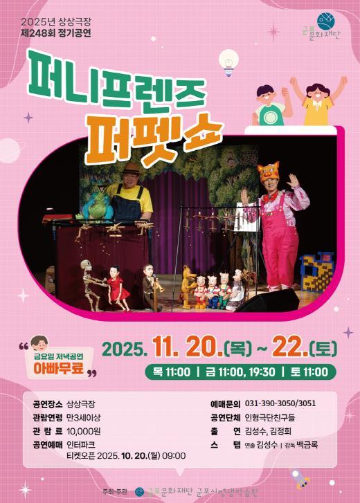 이번 정기공연은 군포시에서 창단해 활발히 활동 중인 인형극단친구들이 참여해 무대를 꾸민다. 상상극장은 정기공연을 통해 지역 예술단체와 가족이 함께하는 문화의 힘을 전하고, 일상 속에서도 예술이 주는 웃음과 생동감을 전하고자 한다.