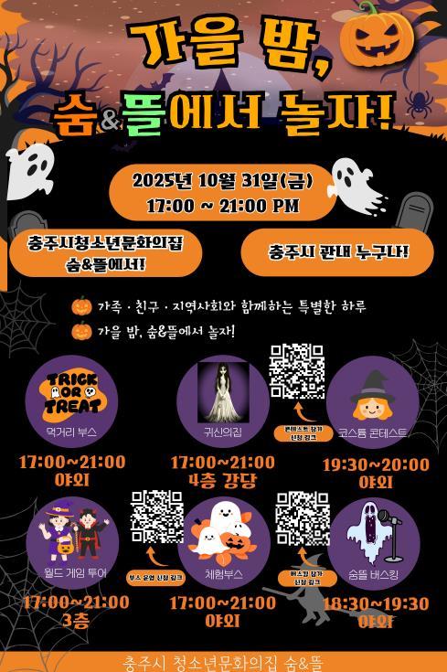[중앙뉴스라인, 우제헌기자] 충주시청소년문화의집 숨·뜰에서는 10월 31일 오후 5시부터 9시까지 ‘가을밤, 숨뜰에서 놀자!’ 행사를 진행한다고 밝혔다.
