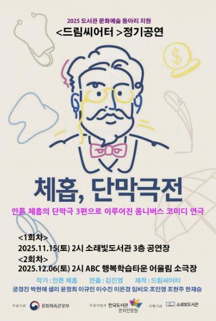 [중앙뉴스라인, 우제헌기자] 시흥시 소래빛도서관을 무대로 한 연극 '체홉, 단막극전'이 오는 11월 시민들을 찾아온다. 문화체육관광부의 2025년 ‘도서관 문화예술 동아리 지원’ 사업의 일환으로 진행되는 이번 연극은 소래빛도서관의 연극동아리 ‘드림씨어터’가 지난 1년간 준비해 온 노력이 결실을 보는 자리다.