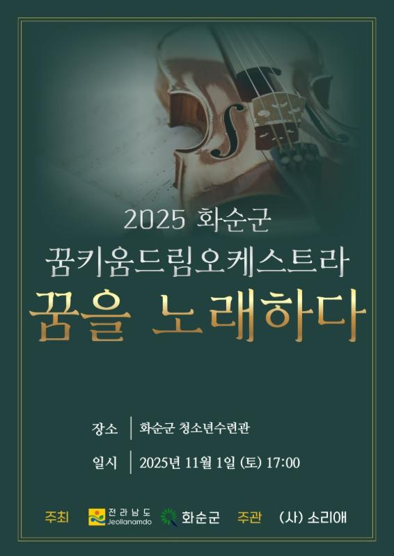 [중앙뉴스라인, 우제헌기자] 화순군은 오는 11월 1일 토요일 오후 5시 화순군 청소년수련관에서 화순군 꿈키움 드림오케스트라 연주발표회『꿈을 노래하다』 무료 공연을 개최한다고 밝혔다.