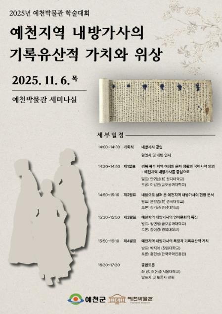 [중앙뉴스라인, 우제헌기자] 예천군 예천박물관은 11월 6일 오후 2시 ‘예천지역 내방가사의 기록유산적 가치와 위상’이란 주제로 학술대회를 개최한다.