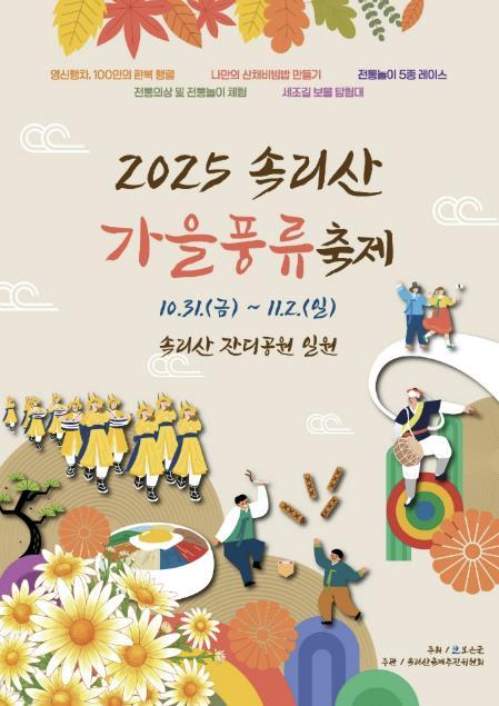 보은군은 오는 10월 31일부터 11월 2일까지 3일간 속리산 잔디공원 일원에서 ‘2025 속리산 가을풍류 축제’를 개최한다고 밝혔다.