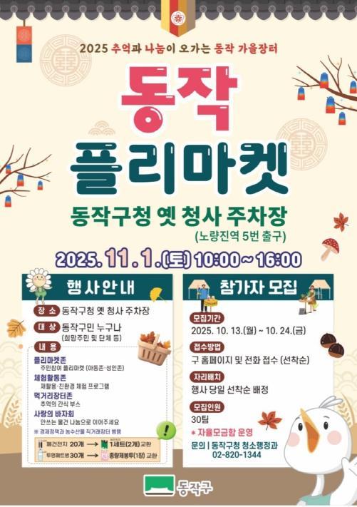 [중앙뉴스라인, 우제헌기자] 동작구가 오는 11월 1일 오전 10시부터 오후 5시까지 구청 옛 청사 주차장(노량진역 5번 출구)에서 ‘2025 추억과 나눔이 오가는 동작 가을장터’를 연다고 밝혔다.
