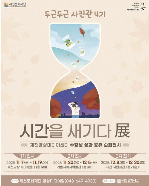 [중앙뉴스라인, 우제헌기자] 제천문화재단이 제천영상미디어센터 교육 수강생들의 작품을 순회 전시하는 '두근두근 사진관 4기 : 시간을 새기다 展'을 오는 11월 7일부터 12월 30일까지 제천시 일원에서 개최한다.
