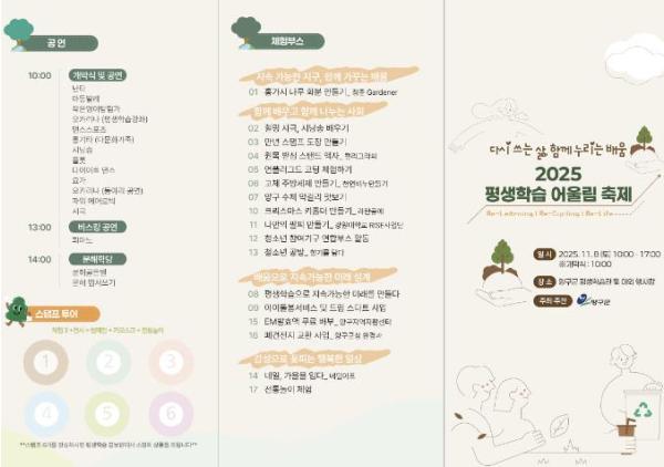 행사장에서는 평생학습 강좌 참여자뿐만 아니라 전 연령층이 즐길 수 있는 다채로운 체험학습 부스와 전시, 전통놀이, 환경캠페인, 버스킹, 공연, 문해 골든벨 등이 ‘스탬프 투어’ 형식으로 운영되어 즐거운 참여형 축제로 꾸며질 예정이다.