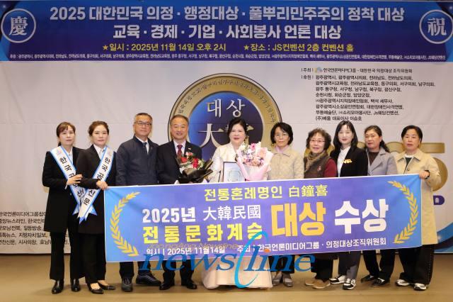[중앙뉴스라인 = 전은희 기자] 우리 고유의 예식문화를 보존하고 현대사회에 맞게 재해석하며 전통문화의 가치를 널리 알린 백종희(白宗熙) 명인이 지난 11월 14일 광주 JS컨벤션홀에서 열린 ‘제9회 대한민국 의정대상 및 풀뿌리 민주주의 정착대상 시상식’에서 ‘2025 대한민국 전통문화 대상’ 전통문화 계승 부문을 수상했다.