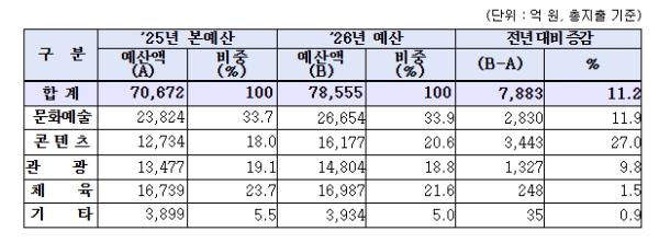 [중앙뉴스라인, 우제헌기자] 문화체육관광부는 2026년도 문체부 예산이 7조 8,555억 원으로 최종 확정되었다고 밝혔다. 이는 올해 본예산 대비 7,883억 원(11.2%)이 증가한 규모이다. 문체부는 이번 예산을 ‘케이-컬처’ 300조 원 시대 출발을 위한 예산으로 콘텐츠산업의 국가전략산업화, 국민이 함께 누리는 관광 등에 주력해 편성했다고 밝힌 바 있다.