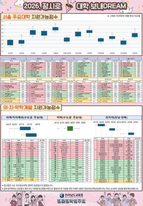이번 배치표에는 수도권과 전라권 의·치·약학계열, 서울 주요 대학, 전남대학의 지원 가능 점수가 함께 제시됐다.